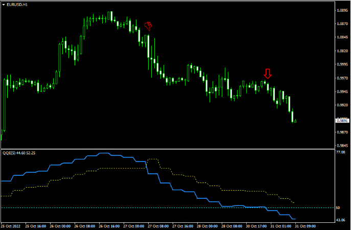 以EUR/USD的小时图为例,该图表采用了4小时的数据来绘制线条。图中两个红色箭头标示了两个看跌信号——第一个信号由线条交叉产生,第二个信号则是蓝色线突破50水平线时出现。