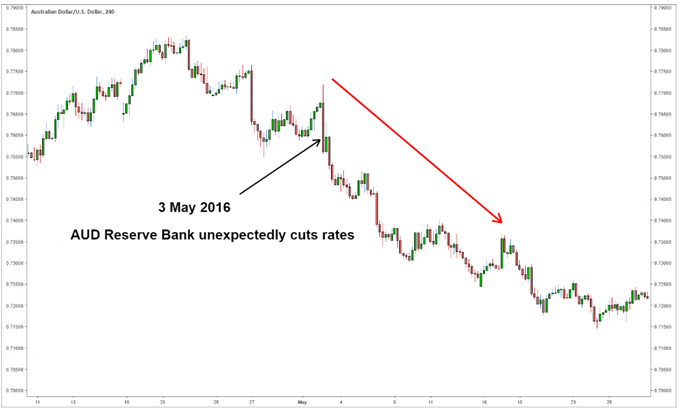 以下是当市场预期央行维持利率不变,但随后央行降低利率时会发生什么情况的例子。在这个例子中,澳大利亚储备银行原本预计将利率维持在 2%,但最终却将其下调至 1.75%。市场对降息感到意外,澳元/美元贬值。
