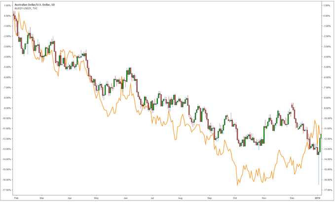 利率及其差异对货币对的升值/贬值有很大影响。利差的变化与货币对的升值/贬值相关。直观上更容易理解。下图比较了澳元/美元货币对(烛台图)以及两年期澳元政府债券和两年期美元政府债券之间的差异(橙色图)。该关系表明,随着澳元债券收益率相对于美元债券下降,货币也会下降。