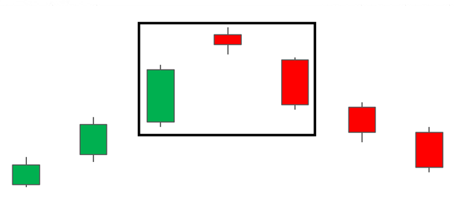 小看跌/看涨蜡烛:第二根蜡烛是一根小蜡烛 - 有时是十字星蜡烛 - 呈现疲倦上升趋势的第一个迹象。通常,当蜡烛达到更高的高点时,它会跳空走高。蜡烛是看跌还是看涨并不重要,因为这里的主要结论是市场有些犹豫不决。