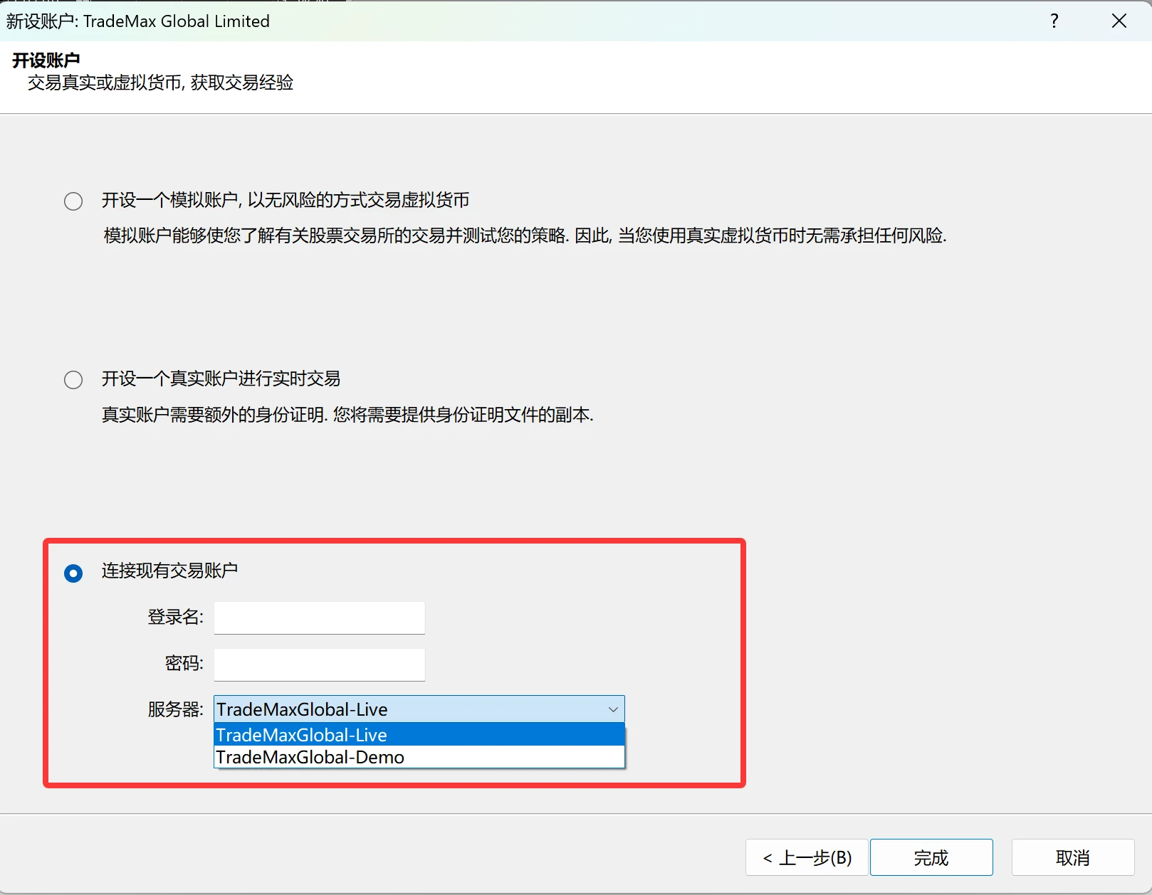 2.在“服务器”栏中,选择“TMGM集团”对应的服务器名称(例如:TradeMaxGlobal)。然后选择“TradeMax Global LMITED”