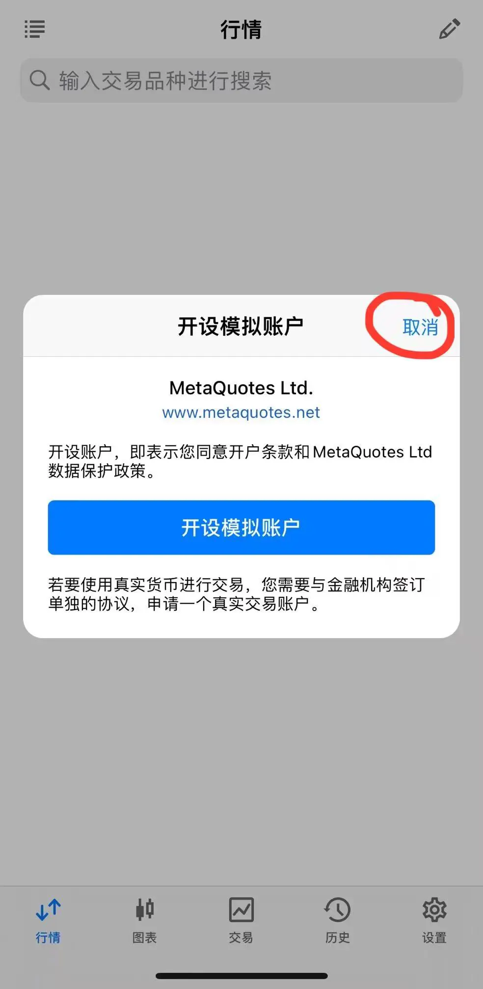 1. 打开MT5应用程序,进入登录界面。如果出现“开设模拟账户”则点击“取消”